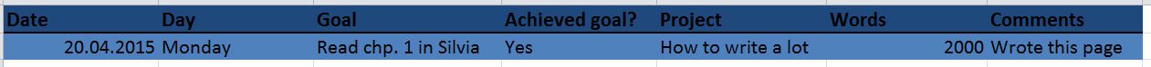 Silvia suggests that you make a spreadsheet with the columns day, date, and year. Essential variables are goals, words and project.